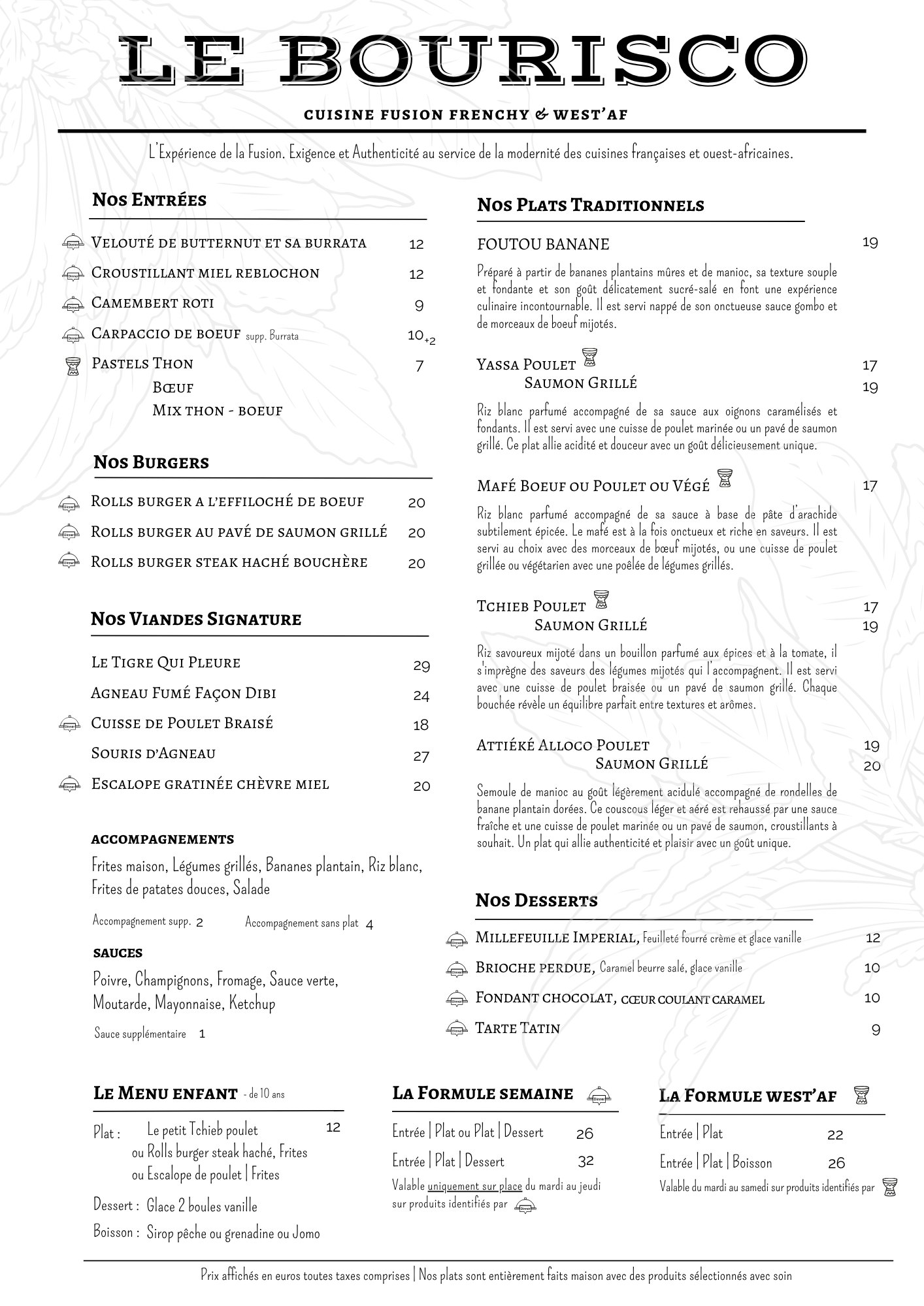 La passion du chef se diffusera dans chacun de ses plats mettant à l'honneur la cuisine française et d'Afrique de l'Ouest !